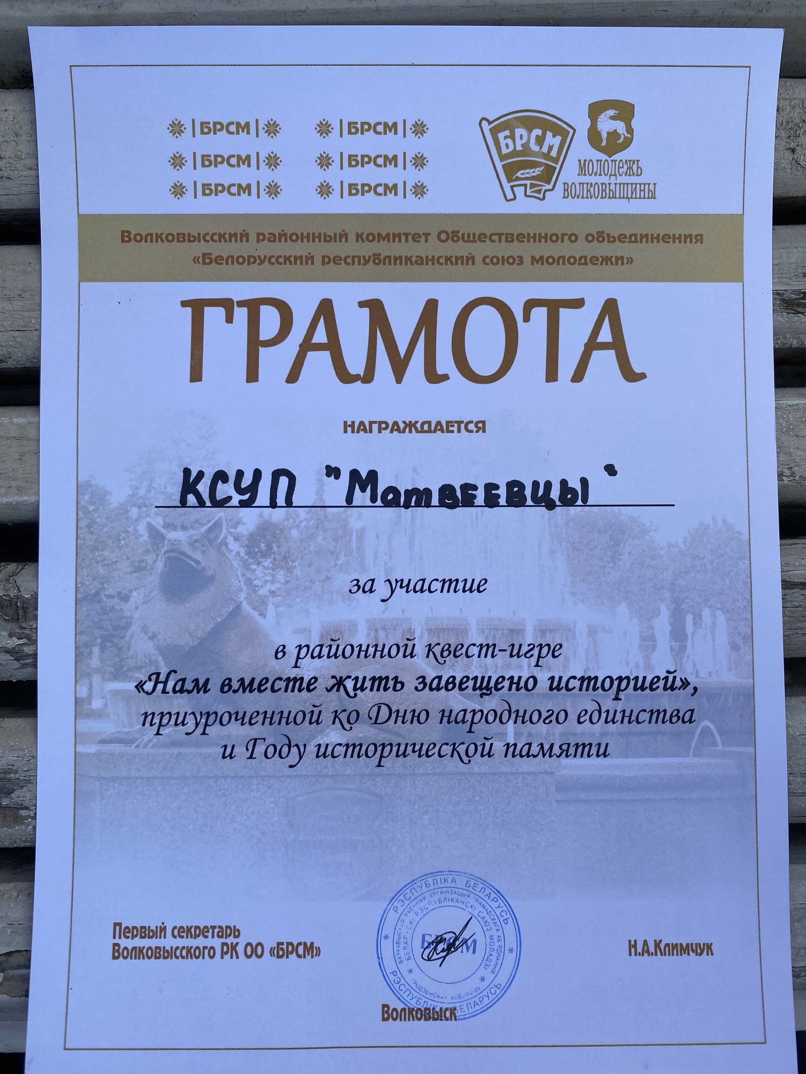 Секретарь первичной организации ПО "БРСМ" КСУП "Матвеевцы" Лишик Дарья Дмитриевна Телефоны: +375 44 599-69-74 Заместитель секретаря первичной организации ПО "БРСМ" КСУП "Матвеевцы" Сальманович Екатерина Михайловна, инспектор по кадрам. Телефоны: +375 33 658 34 40 |